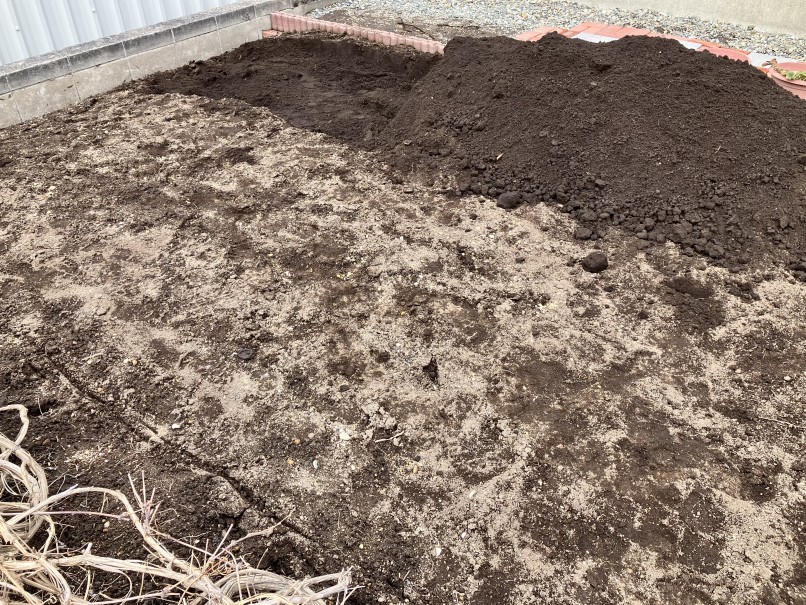 先週は気温が高くて晴天が続いていましたので、今年の畑対策にいわゆる「天地返し」をしてみました。昨年は生育期に外壁のリフォームがあって2ヶ月間以上足場とそれを囲うネットで畑全体の風通しが悪かったせいか、輪作をしていたものの、連作障害が出て作物の収量が落ちました。なので自力でできる方法を試してみました。