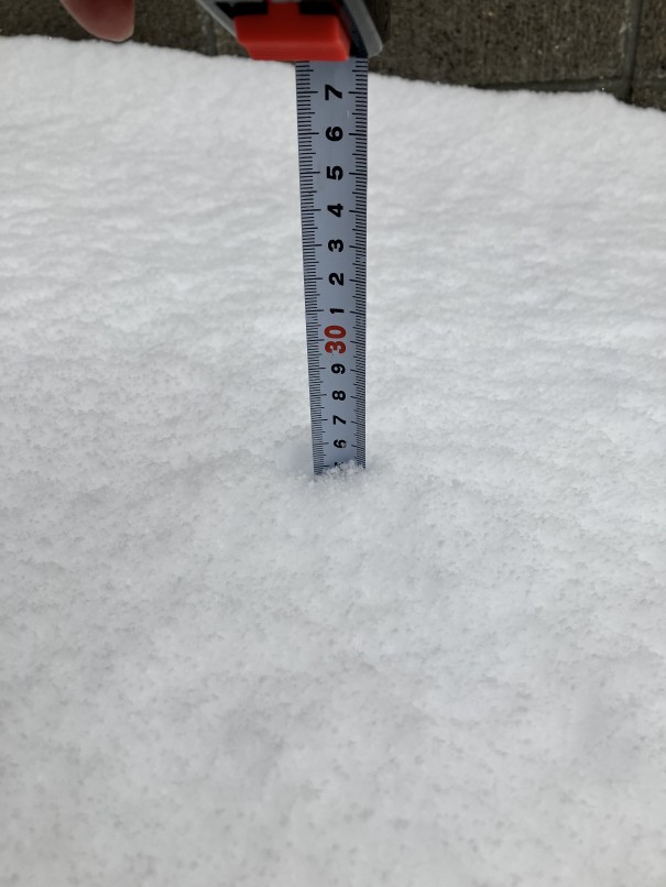 12月10日9時過ぎの画像です。メモリは26センチです。昨日が16センチだったので単純にプラス10センチかと思いきや、実際はさらに積もって自重で圧縮されています。